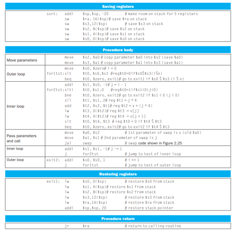sort 프로시저도 레지스터 $a0와 $a1을 사용하고, swap 프로시저도 인수 전달을 위해 같은 레지스터를 사용해야 한다. 스택에 저장했다 복구하는 방법도 있지만, 프로시저 앞부분에서 sort의 인수를 다른 레지스터에 복사해서 swap을 호출할 때 레지스터 $a0와 $a1을 사용할 수 있게 하는게 더 빠르다.